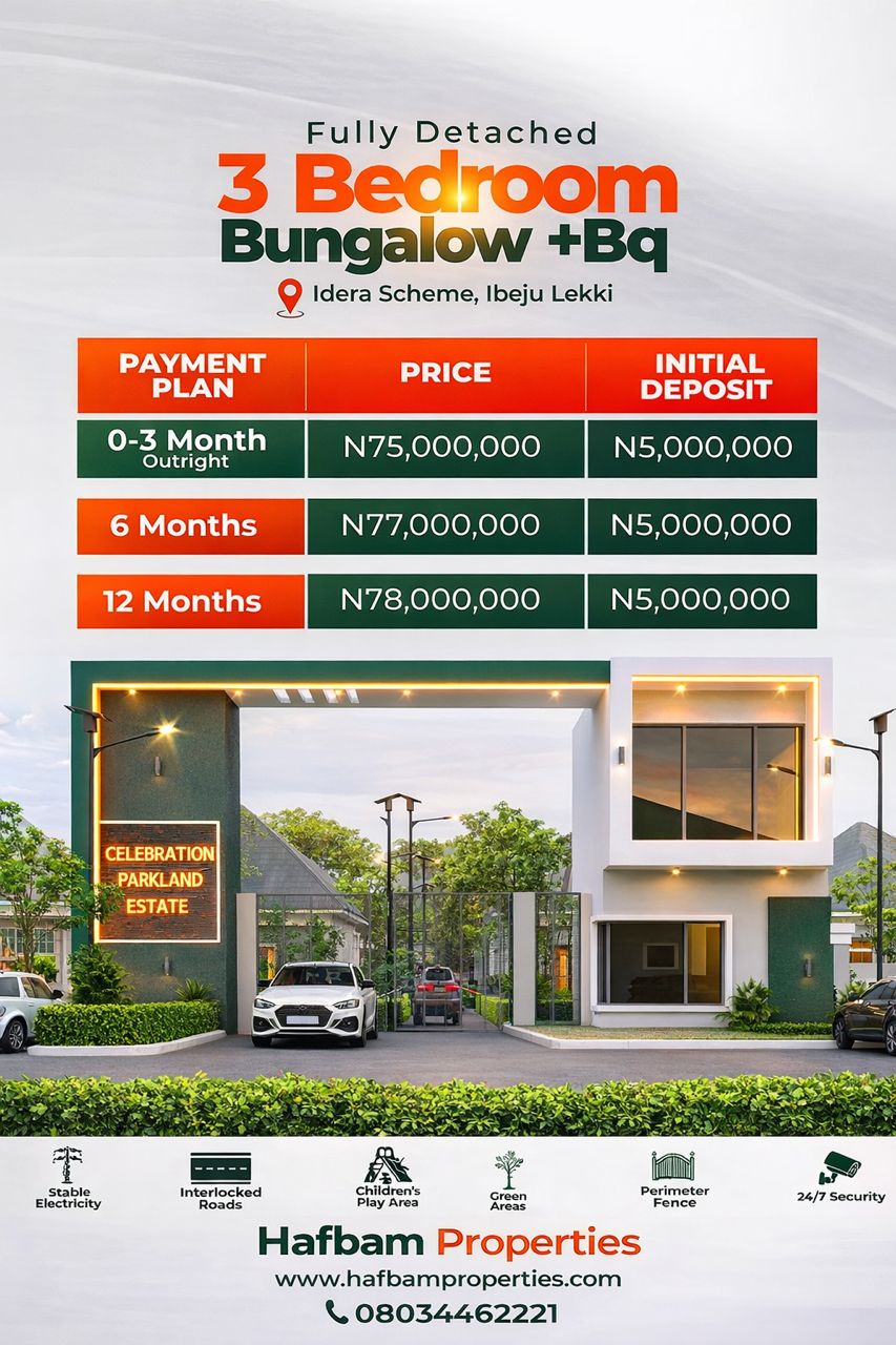 3-Bedroom Fully Detached Bungalows with BQ located at Celebration Parkland Estate & Resort, Idera Scheme, Eleko (Ibeju-Lekki).